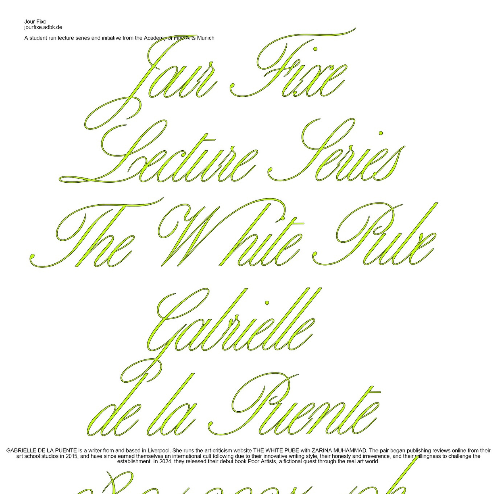 **due to flight cancellations… Gabrielle de la Puente will have to join the lecture online tonight. We will still gather at the Academy and stream the lecture there. Gabrielle de la Puente is a writer from and based in Liverpool. She runs the art criticism website The White Pube with Zarina Muhammad. The pair began publishing reviews online from their art school studios in 2015, and have since earned themselves an international cult following due to their innovative writing style, their honesty and irreverence, and their willingness to challenge the establishment. In 2024, they released their debut book Poor Artists,…