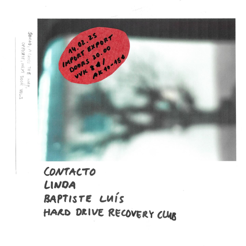 A non-frontal live format where the music is spread across the whole space. It is meant for everyone who wants to play music and not to entertain, to listen and not to consume, to try something and not to expect something. The first volume features music from folk to chamber pop, from beats to ambient music and textures. Everyone is welcome to hang out. Perfect for everyone seeking a slower, more elusive Friday night. Artist: Contacto Linda Hard Drive Recovery Clun: Chris & Kathrin Baptist Luis
