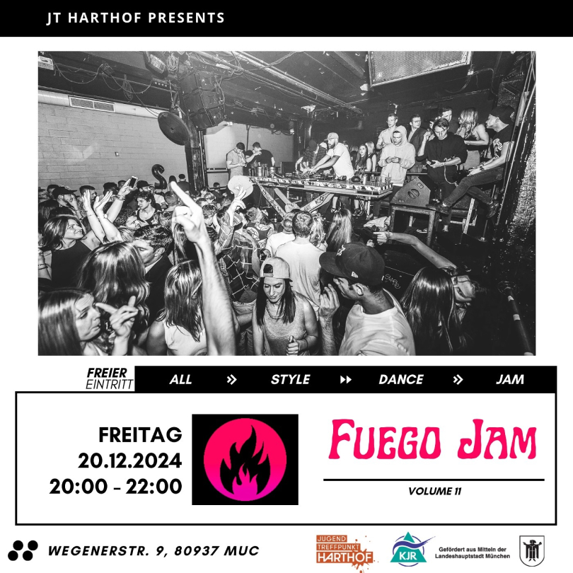 We proudly present the FINAL ONE: . 11! Free Entry! Everyone is welcome – dancers, non-dancers, and all age groups! Fuego Jam is an all-style dance jam with live DJs playing diverse music for the audience. The event focuses on intercultural (dance) exchange, which is a fundamental aspect of hip-hop culture. Supported by Youth Meeting Point Harthof and KJR Munich.